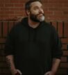 A collection of skincare products is artfully arranged on an olive green backdrop. Several cylindrical bottles and jars, some with labels, are prominently displayed. A large leaf is being held above the setup, adding a natural, organic element. Small rocks and green gummies are scattered around, enhancing the aesthetic presentation.